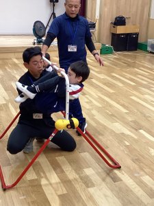 その後は、5歳児のお友達が運動遊びに参加しました。鉄棒がうまくなるために、体の使い方を教えてもらいました。くまさん歩きやわにの動きなど進んで体を動かしていました。