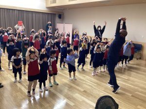 みんなで「にっこりマンボーダンス」を踊りました。初めてのダンスでしたが、みんなノリノリで踊っていましたよ。