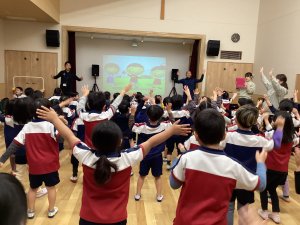 映画紙芝居で交通ルールやお外で遊んでいる時のルールなどを楽しく学ぶことができました。映画紙芝居の中に振り付けがあり、振り付けをしながら楽しんでみていました。